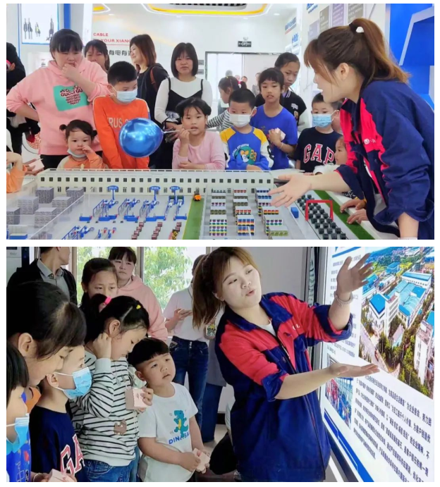 為了幫助孩子們更好地理解電纜電線制造,本次活動特意安排了展廳參觀環節,在展廳,通過樣品展示和講解,湘聯寶貝們能夠直觀的了解電纜電線的制造工藝與流程,對爸爸媽媽的工作有了初步的認識與感知。當得知爸爸媽媽的工作成果被用于醫院、景區、大型商場等各種場所建設,為大家點亮燈火,傳遞光明時,小朋友們對爸爸媽媽的工作更加崇敬。